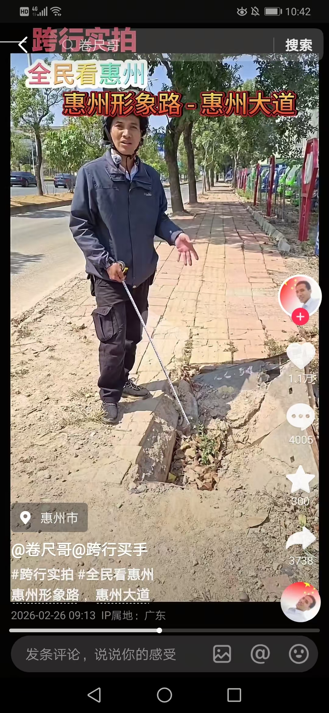 “卷尺哥”实拍惠州破损人行道,官方回应:正加紧维修