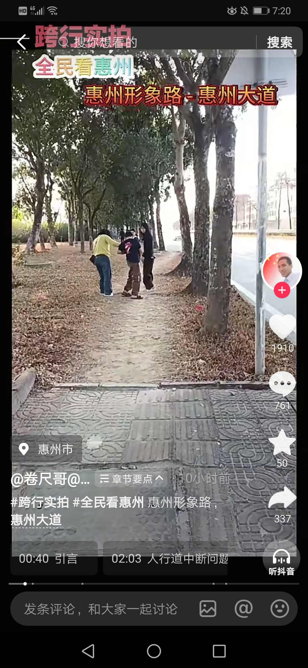 近日,深圳知名短视频博主“卷尺哥@跨行买手”实拍惠州,发布“全民看惠州”系列视频,接连反映了惠州大道马安、小金口和平潭路段人行道破损及缺失等问题,网友热议,惠州主管部门积极跟进处置修复。